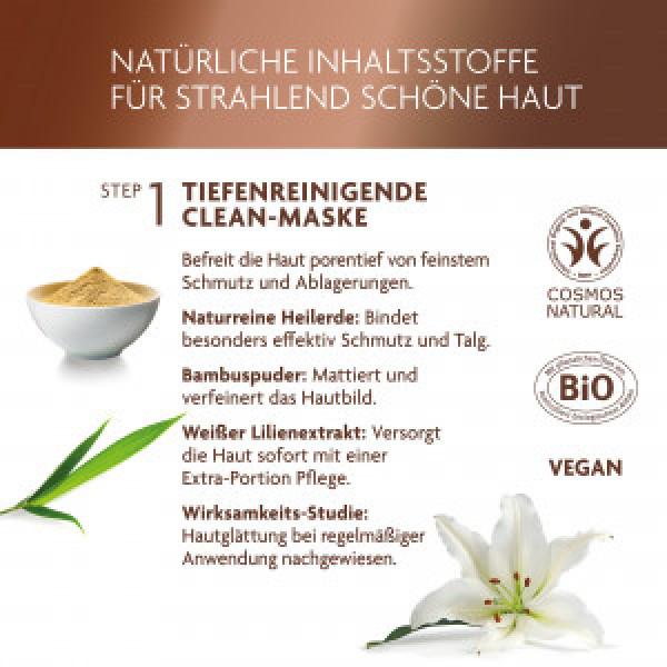 In der Clean-Maske mit weißem Lilien-Extrakt bindet die naturreine Heilerde durch ihre enorme Saugkraft im Mix mit mattierendem Bambuspuder Schmutz, Talg und Ablagerungen und reinigt so gründlich. Das glättet nachweislich die Hautoberfläche. Der anschließende Lifting-Booster enthält Parakresse – bekannt durch seine Sofortstraffungswirkung, hochmolekulare Hyaluronsäure und hochwertiges Aprikosenkernöl. Diese durchfeuchten, regenerieren und straffen die Haut sofort – mit nachweislichem Langzeit-Effekt.