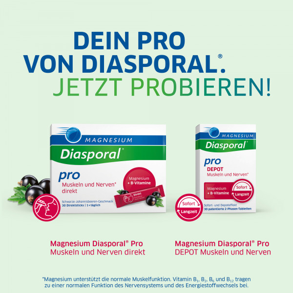 Magnesium Diasporal® gehört seit vielen Jahren zu den bekanntesten und beliebtesten Magnesium-Präparaten in der Apotheke. Die Qualitätsprodukte von Protina, mit Sitz in Deutschland, werden weltweit vertrieben, erfüllen strenge pharmazeutische Standards und werden auf Basis aktueller ernährungsphysiologischer Erkenntnisse entwickelt. Das Sortiment von Magnesium Diasporal® bietet hochwertige Produkte in unterschiedlichen Dosierungen und Darreichungsformen zur täglichen Magnesiumversorgung. Erweitert werden diese Magnesium-Präparate nun von Magnesium Diasporal® Pro. Magnesium Diasporal® Pro kombiniert hoch dosiertes Magnesium mit weiteren wichtigen Nährstoffen für Körper und Geist und trägt so proaktiv dazu bei, mit voller Energie durchs Leben zu gehen. Diasporal®. Für dein Leben in Bewegung. Liebe Kundin, lieber Kunde, wir freuen uns, dass Sie sich für ein Präparat von Magnesium Diasporal® Pro entschieden haben. Alle wichtigen Informationen zum Sortiment von Magnesium Diasporal® Pro haben wir hier für Sie zusammengestellt. Das von Ihnen gekaufte Produkt kann sich auch auf der Rückseite befinden. Ihr Diasporal®-Team hoch dosiert B-Vitamine vegan zuckerfrei glutenfrei laktosefrei pro Muskeln und Knochen* Nahrungsergänzungsmittel mit Magnesium, Vitamin D₃ und K₂ in hoch dosierter Kombination für Muskeln, Knochen und Abwehrkräfte. Um uns stark, fit und vital zu fühlen, benötigen wir gesunde Muskeln, Knochen und Abwehrkräfte. Hierzu leistet Magnesium Diasporal® Pro Muskeln und Knochen einen sinnvollen Beitrag: * Magnesium unterstützt eine normale Muskelfunktion. * Vitamin D₃ und Vitamin K₂ tragen zur Erhaltung normaler Knochen bei. Vitamin D₃ leistet einen Beitrag zur normalen Funktion des Immunsystems. Für die Gesundheit von Knochen und Muskulatur ist die ausreichende Versorgung mit Mikronährstoffen von großer Bedeutung. Magnesium, Vitamin D₃ und Vitamin K₂ ergänzen sich in ihrer Funktion. Magnesium Diasporal® Pro Muskeln und Knochen* direkt • Direktsticks zur schnellen Einnahme ohne Wasser • Nur 1 × täglich • Maracuja-Geschmack Magnesium Diasporal® Pro DEPOT Muskeln und Knochen* • Patentierte 2-PhasenTabletten mit Sofort- und Langzeitfreisetzung • Nur 1 × täglich • Leicht zu schlucken Magnesium Diasporal® Pro Muskeln und Knochen* ist in 2 Darreichungsformen erhältlich: • als Direktsticks für die schnelle Einnahme unterwegs, ganz ohne Wasser. Die Sticks schmecken fruchtig-frisch nach Maracuja und lösen sich direkt im Mund. • als 2-Phasen-Tabletten, mit einzigartigem Patent. 2 Tablettenschichten arbeiten nach dem Prinzip der schnellen sowie zeitverzögerten kontinuierlichen Freisetzung. Die Tabletten sind leicht zu schlucken durch einen Überzug mit angenehmem Vanillegeschmack sowie einer Bruchkerbe, die einfaches Teilen erlaubt. Jede Tagesdosis enthält: 300 mg Magnesium (80 % NRV), 75 µg Vitamin K₂ (100 % NRV) und 50 µg (2000 I.E.) Vitamin D₃ (1000 % NRV). Die patentierten 2-Phasen-Tabletten — angepasst an die menschliche Physiologie: Magnesium Diasporal® Pro DEPOT Muskeln und Nerven* | Magnesium Diasporal® Pro DEPOT Muskeln und Knochen* Mehr erfahren auf diasporal.com Sofort-Phase In der Sofort-Phase wird Magnesium in kurzer Zeit im sauren Milieu des Magens gelöst und steht dem Körper schnell zur Verfügung. Langzeit-Phase Aus der Langzeit-Phase wird Magnesium durch eine spezielle Retardierung über mehrere Stunden im alkalischen Milieu des Darms freigesetzt und kann dort kontinuierlich resorbiert werden. saures Milieu alkalisches Milieu Liebe Kundin, lieber Kunde, wir freuen uns, dass Sie sich für ein Präparat von Magnesium Diasporal® Pro entschieden haben. Alle wichtigen Informationen zum Sortiment von Magnesium Diasporal® Pro haben wir hier für Sie zusammengestellt. Das von Ihnen gekaufte Produkt kann sich auch auf der Rückseite befinden.
