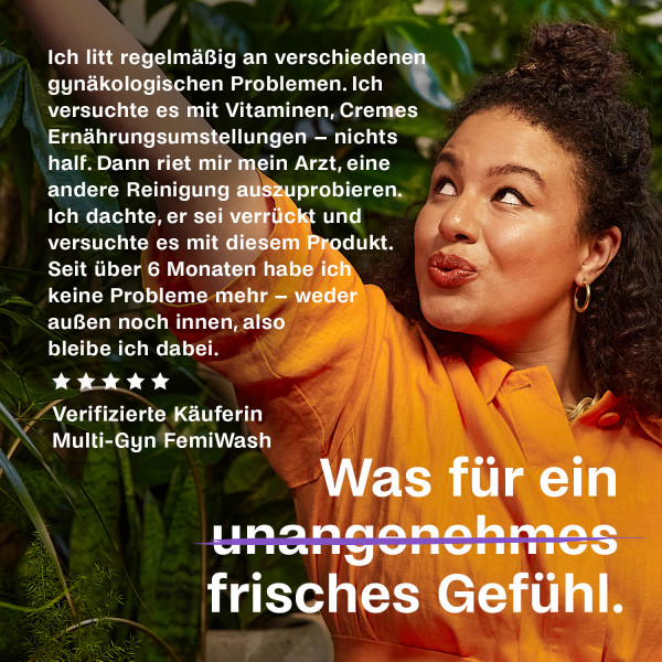 Noch auf der Suche nach einer milden Intimpflege? Multi-Gyn® FemiWash reinigt und erfrischt den Intimbereich sanft und eignet sich insbesondere zur Anwendung bei sehr empfindlicher Haut. Der Mikroschaum ist ideal für die tägliche Intimpflege und eignet sich auch für eine sanfte Rasur. Multi-Gyn® FemiWash ist seifenfrei, ohne Duftstoffe und schützt die natürliche Scheidenflora. Der praktische Pumpspender dosiert den Schaum in der richtigen Menge, sodass ca. 120 Anwendungen möglich sind.