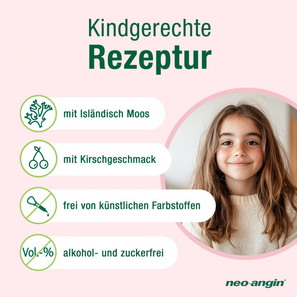 Auch die Darreichungsform spielt je nach Alter des Kindes eine Rolle: Halstabletten sollten Kinder erst bekommen, wenn sie sicher lutschen können, damit sie sich nicht an ihnen verschlucken. Darum hat neo-angin® für Kinder ab 1 Jahr den neo-angin® junior Halsschmerzsaft im Portfolio: Diesen können Kinder einfach mit dem Löffel einnehmen. Er schmeckt nicht nur lecker nach Kirsche, sondern schützt und beruhigt die Schleimhäute in Mund und Rachen der kleinen Patienten.