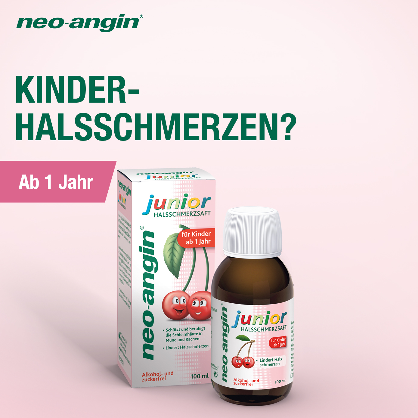 Hilfe bei Halsschmerzen für die Allerkleinsten: Der neo-angin® junior Halsschmerzsaft schützt und beruhigt die Schleimhäute und lindert die Schmerzen im Hals. Er ist frei von Zucker und Alkohol und schmeckt lecker nach Kirsche.