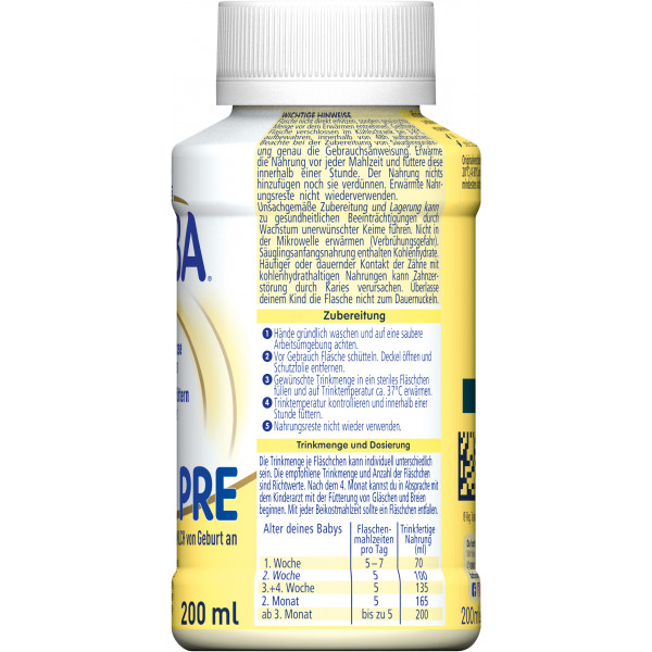Flasche nicht direkt erhitzen, sondern gewünschte Menge vor dem Erwärmen entnehmen. Beachten Sie bei der Zubereitung von Säuglingsnahrung genau die Gebrauchsanweisung. Erwärmen Sie die Nahrung vor jeder Mahlzeit und füttern Sie diese innerhalb einer Stunde. Der Nahrung nichts hinzufügen noch sie verdünnen. Erwärmte Nahrungsreste nicht wiederverwenden. Unsachgemäße Zubereitung und Lagerung kann zu gesundheitlichen Beeinträchtigungen durch Wachstum unerwünschter Keime führen. Nicht in der Mikrowelle erwärmen (Verbrühungsgefahr). Säuglingsanfangsnahrungen enthalten Kohlenhydrate. Häufiger oder dauernder Kontakt der Zähne mit kohlenhydrathaltigen Nahrungen kann Zahnzerstörung durch Karies verursachen. Überlassen Sie Ihrem Kind die Flasche nicht zum Dauernuckeln.