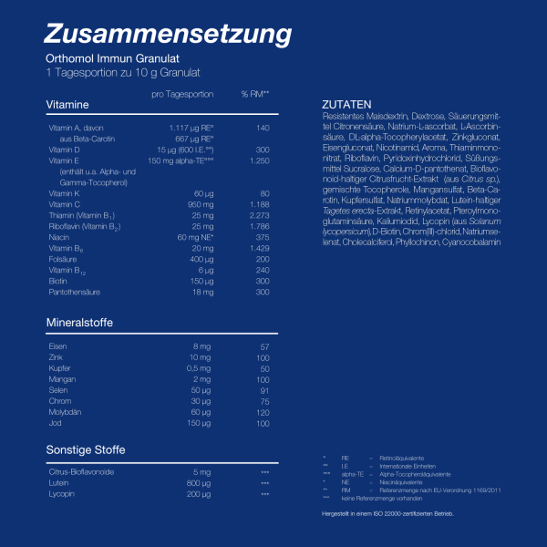 Im Falle von Orthomol Immun werden gemäß der entsprechenden Zweckbestimmung die Höchstmengen von Vitamin E, C, Thiamin (Vitamin B1), Riboflavin (Vitamin B2), B6 und Biotin über- und die Mindestmengen der Vitamine D und K sowie der Mineralstoffe Natrium, Eisen, Kupfer und Molybdän unterschritten.