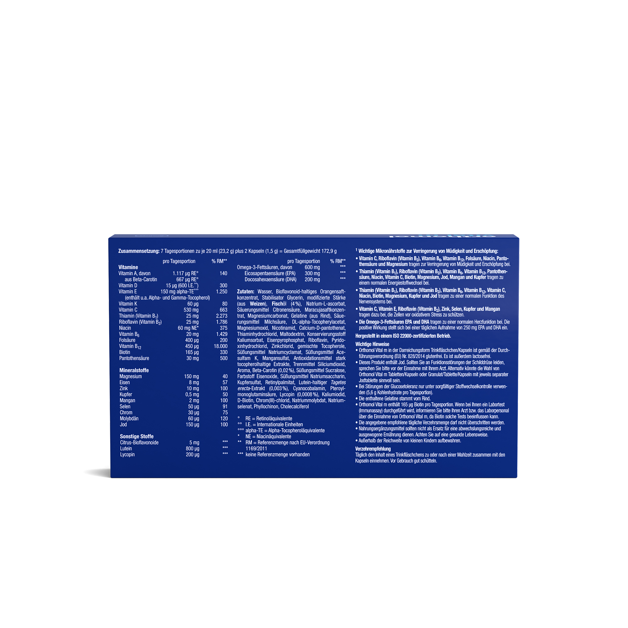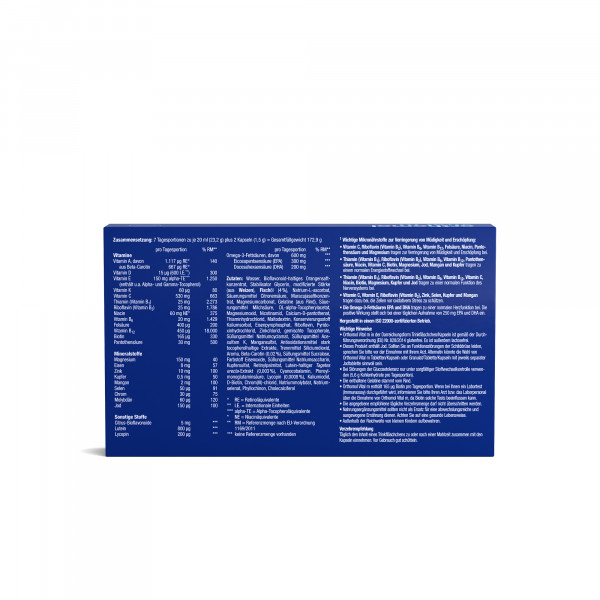 Wasser, Bioflavonoid-haltiges Orangensaftkonzentrat, Stabilisator Glycerin, modifizierte Stärke (aus Weizen), Fischöl (4 %), Natrium-L-ascorbat, Säuerungsmittel Citronensäure, Maracujasaftkonzentrat, Magnesiumcarbonat, Gelatine (aus Rind), Säuerungsmittel Milchsäure, DL-alpha-Tocopherylacetat, Magnesiumoxid, Nicotinamid, Calcium-D-pantothenat, Thiaminhydrochlorid, Maltodextrin, Konservierungsstoff Kaliumsorbat, Eisenpyrophosphat, Riboflavin, Pyridoxinhydrochlorid, Zinkchlorid, gemischte Tocopherole, Süßungsmittel Natriumcyclamat, Süßungsmittel Acesulfam K, Mangansulfat, Antioxidationsmittel stark tocopherolhaltige Extrakte, Trennmittel Siliciumdioxid, Aroma, Beta-Carotin (0,02 %), Süßungsmittel Sucralose, Farbstoff Eisenoxide, Süßungsmittel Natriumsaccharin, Kupfersulfat, Retinylpalmitat, Lutein-haltiger Tagetes erecta-Extrakt (0,003 %), Cyanocobalamin, Pteroylmonoglutaminsäure, Lycopin (0,0008 %), Kaliumiodid, D-Biotin, Chrom(III)- chlorid, Natriummolybdat, Natriumselenat, Phyllochinon, Cholecalciferol