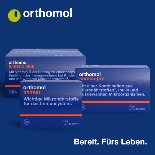 OrthomolNahrungsergänzungsmittel sind kein Ersatz für eine ausgewogene und abwechslungsreiche Ernährung und eine gesunde Lebensweise. Die angegebene empfohlene tägliche Verzehrsmenge darf nicht überschritten werden. Außerhalb der Reichweite von kleinen Kindern aufbewahren.