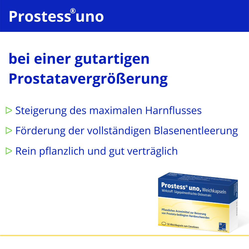 - BESCHWERDEN LINDERN: Prostess uno ist ein pflanzliches Arzneimittel, dass die Beschwerden bei einer gutartigen Vergrößerung der Prostata mildert und das Wasserlassen erleichtert