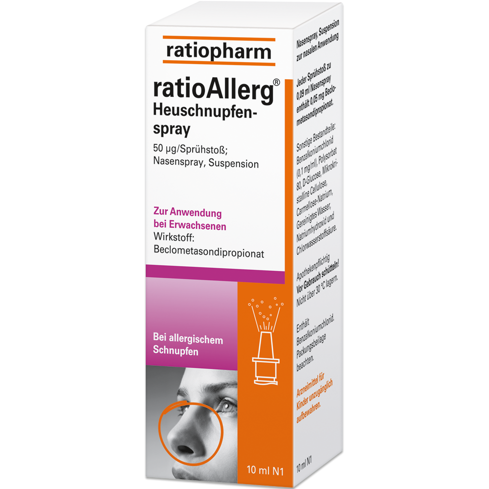 ratioAllerg® Heuschnupfenspray ist ein Kortikoid mit entzündungshemmender Wirkung zur Anwendung in der Nase (Rhinologikum).