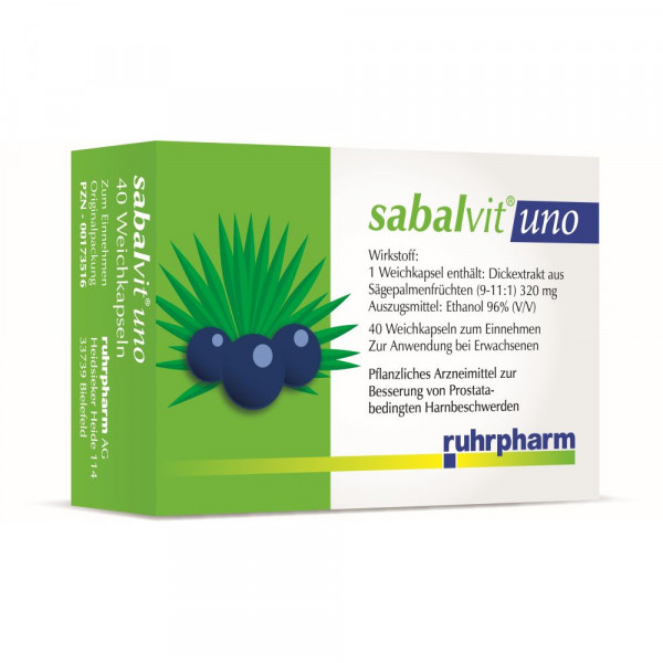 Sabalvit Uno ist ein pflanzliches Arzneimittel bei Prostata-bedingten Harnbeschwerden. Sabalvit Uno wird angewendet bei Beschwerden beim Wasserlassen bei einer gutartigen Vergrößerung der Prostata (Miktionsbeschwerden bei benigner Prostatahyperplasie im Stadium I bis II nach Alken bzw. II bis III nach Vahlensieck).