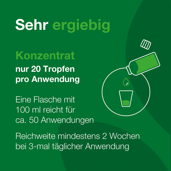 Dunkelgrüne Flüssigkeit in Packungen mit 20 ml (N1), 50 ml (N2) und 100 ml (N3).