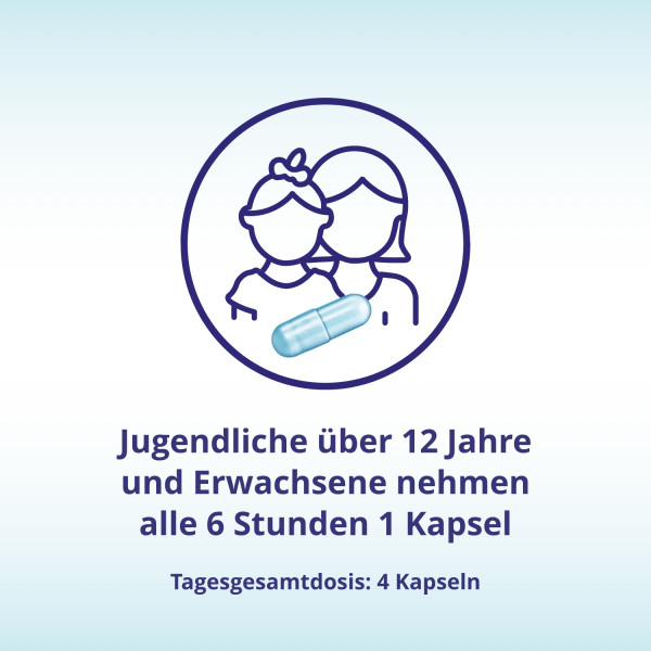 | Jugendliche ab 12 Jahren und Erwachsene | 1 Kapsel | 1-4 mal täglich | im Abstand von 6 Stunden, unabhängig von der Mahlzeit |