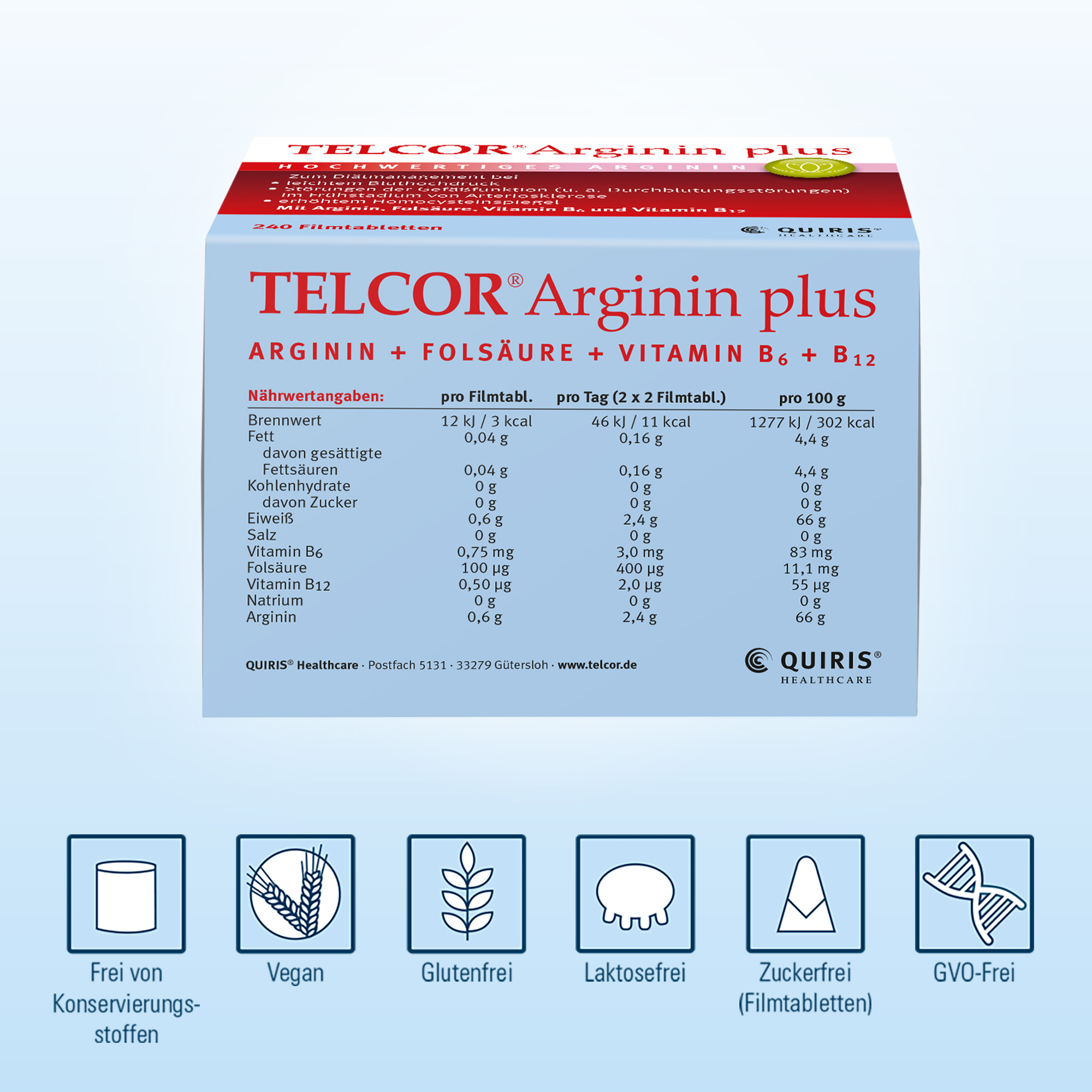 Zur diätetischen Behandlung von: leichtem Bluthochdruck Störungen der Gefäßfunktion (u. a. Durchblutungsstörungen) im Frühstadium von Arteriosklerose erhöhtem HomocysteinspiegelAufgrund der sehr guten Verträglichkeit kann Telcor® Arginin plus zusammen mit anderen Medikamenten, wie z. B. vom Arzt verordneten Blutdrucksenkern, eingenommen werden und ist für eine Langzeitanwendung geeignet. Die Anwendung ersetzt nicht die vom Arzt verordneten Medikamente.Für Diabetiker empfohlen! Mit Telcor® Arginin plus werden dem Körper sinnvoll abgestimmte Mengen an Arginin und B-Vitaminen zugeführt, die positive Effekte auf die Gefäß- und Herzgesundheit haben. Unser Körper bildet aus Arginin, in speziellen Zellen der Gefäßinnenwand, den wichtigen Botenstoff Stickstoffmonoxid (NO). Dieser natürliche Botenstoff entspannt die Blutgefäße, unterstützt damit die körpereigene Blutdruckregulation und verbessert die Elastizität der Blutgefäße. So wird das Herz auf natürliche und physiologische Weise entlastet und unterstützt. Als Radikalfänger kann das aus Arginin gebildete NO zudem entzündlichen Prozessen in den Gefäßen entgegenwirken und die Durchblutung mit einer ausreichenden Nährstoff- und Sauerstoffversorgung im gesamten Organismus unterstützen.In Telcor® Arginin plus wird ausschließlich besonders hochgereinigtes Arginin der Premiumqualität PROArgin® mit natürlichem Ursprung eingesetzt. Mit einer speziell entwickelten dreifachen Umkristallisation wird höchste Arginin-Reinheit gewährleistet. Diese einzigartige PROArgin®-Qualität gewährleistet in Telcor® Arginin plus die höchsten Sicherheits- und Qualitätsstandards.Das Arginin wird durch eine Fermentation (Bioreaktion) aus pflanzlichen Rohstoffen und damit auf rein natürliche Weise gewonnen. Es entspricht vollständig dem natürlichen Arginin, welches in geringen Mengen auch in vielen Lebensmitteln wie Gemüse, Fleisch und Nüssen vorkommt. Mit der gleichzeitigen Einnahme von B-Vitaminen, insbesondere der Folsäure, werden die ernährungsmedizinischen Effekte von Arginin durch Steigerung der NO-Bildung gefördert. Umso wichtiger ist es, Arginin zusammen mit diesen B-Vitaminen einzunehmen, z. B. mit Telcor® Arginin plus, da diese einzigartige synergistische Nährstoffkombination mehr bewirken kann als die Einnahme der einzelnen Stoffe. Gleichzeitig unterstützen die B-Vitamine den Abbau von unerwünschtem Homocystein und verringern damit den oxidativen Stress.Da gerade für Bluthochdruckpatienten ein möglichst niedriger Homocysteinspiegel wichtig ist, sollte auf eine ausreichende Zufuhr dieser Vitamine geachtet werden. Folsäure, Vitamin B6 und B12 sind vornehmlich in Blattgemüse, aber auch in Vollkornprodukten enthalten.