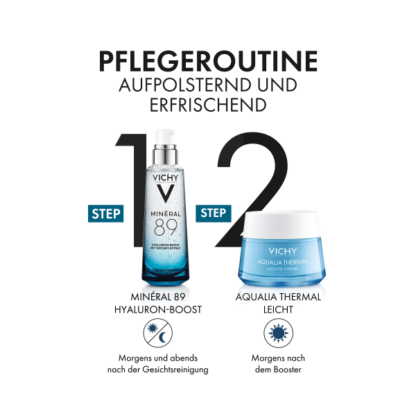 AQUALIA THERMAL LEICHTE FEUCHTIGKEITSPFLEGE morgens und abends auf das gereinigte Gesicht auftragen. Für den extra Feuchtigkeits-Boost vorher den Mineral 89 Booster verwenden.