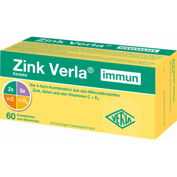 Eine optimale Versorgung mit Zink, Selen, Vitamin C und Vitamin D ist sehr wichtig, denn alle diese Mikronährstoffe tragen unter anderem zu einer normalen Funktion des Immunsystems bei. Mit Zink Verla® immun Caps können Sie Ihre tägliche Ernährung und Ihre Abwehrkräfte mit einer 4-fach-Kombination sinnvoll unterstützen. Die Kautabs sind Ihr idealer Begleiter für unterwegs, da sie schnell und einfach ohne Wasser gekaut oder gelutscht werden können. Sie haben außerdem einen fruchtig-frischen Geschmack nach Cassis (schwarze Johannisbeere). Zusätzlich wird in den Zink Verla® immun Caps Acerola als natürliche Vitamin-C-Quelle verwendet.